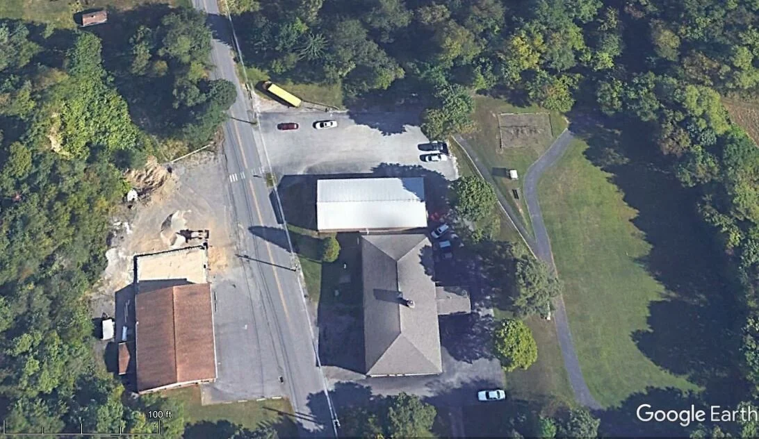This is an aerial photograph of the Middle Taylor Township fire hall (left - west) and the old school building. Benshoff Hill Road separates the two buildings. The old school is now a municipal building for the township (Google Earth 2019).