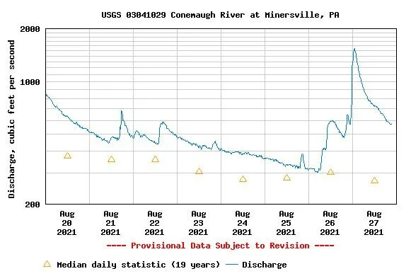 As I developed this portion of my website, these were the current (random) statistics for the Conemaugh River at this station. The gauge height for the river read 3.36 feet and the flow rate was 1,070 cubic feet per second (cfs). Incidentally, one cubic foot per second (cfs) is equivalent to a flow of about 450 gallons per minute. Therefore, a flow rate of 1,070 cubic feet per second is equivalent to 480,430 gallon per minute or 691.8 million gallons per day (MGD). The website shows the triggers for river flooding at this location as follows: flood stage is at 28 feet; moderate flood stage is at 30 feet; and major flood stage is at 34 feet. There is an “action” stage set at 23 feet which I suppose means when National Weather Service flood warning notifications are issued or when things really “start to get serious”.